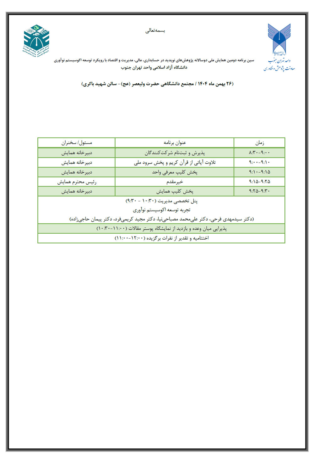 ** مکان ارائه مقالات سخنرانی: مجتمع دانشگاهی حضرت ولی عصر (عج)، ساختمان شماره 1 طبقه 3  سالن جلسات
