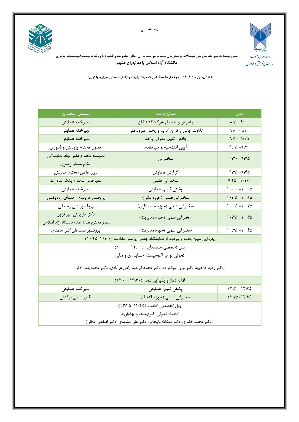 مکان برگزاری همایش: تهران، خ. دماوند، بعد ازمیدان امام حسین، مجتمع دانشگاهی علوم انسانی ولیعصر (عج) دانشگاه آزاد اسلامی واحد تهران جنوب، سالن شهید باکری