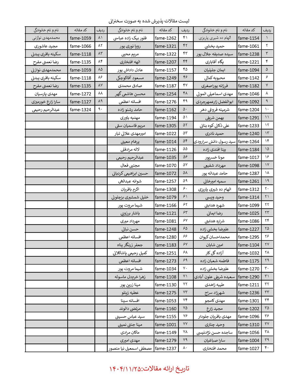 لیست مقالات پذیرش شده به صورت سخنرانی